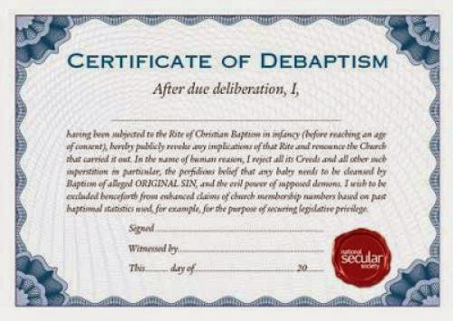 Several new websites are now offering "DE-BAPTISM" certificates for those who wish to formally leave their Christian Churches. While requesting a certificate from a website is at least as pointless as an infant baptism ritual from a spiritual perspective, its political significance cannot be overlooked.